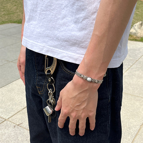 アームにツイステッドワイヤーを施し、石の周りをスタンプとシルバーボールであしらったオールドスタイルのバングル。