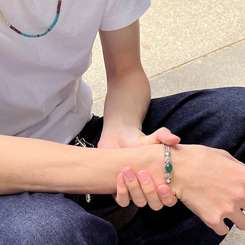 深みのある落ち着いたカラーのグリーンオニキスに、繊細なオールドスタイルのシルバーバングルはシーズンレスに着用頂けます。