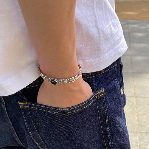 アームにツイステッドワイヤーを施し、石の周りをスタンプとシルバーボールであしらったオールドスタイルのバングル。
